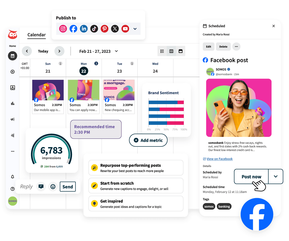 Save time by scheduling and publishing photos and videos right from the Hootsuite dashboard. Whip up posts in seconds with built-in Facebook post templates and an AI-powered Facebook caption writer.
